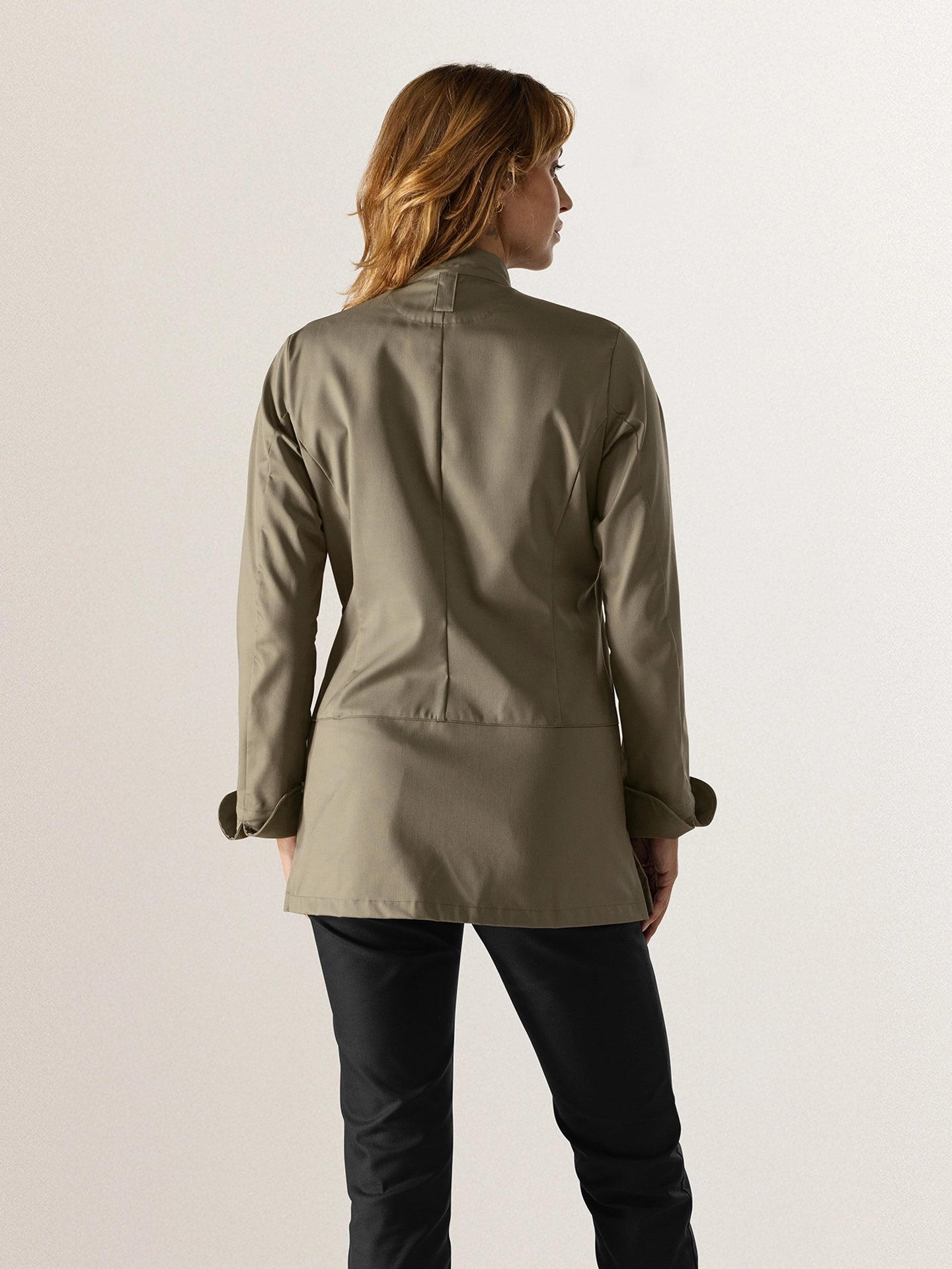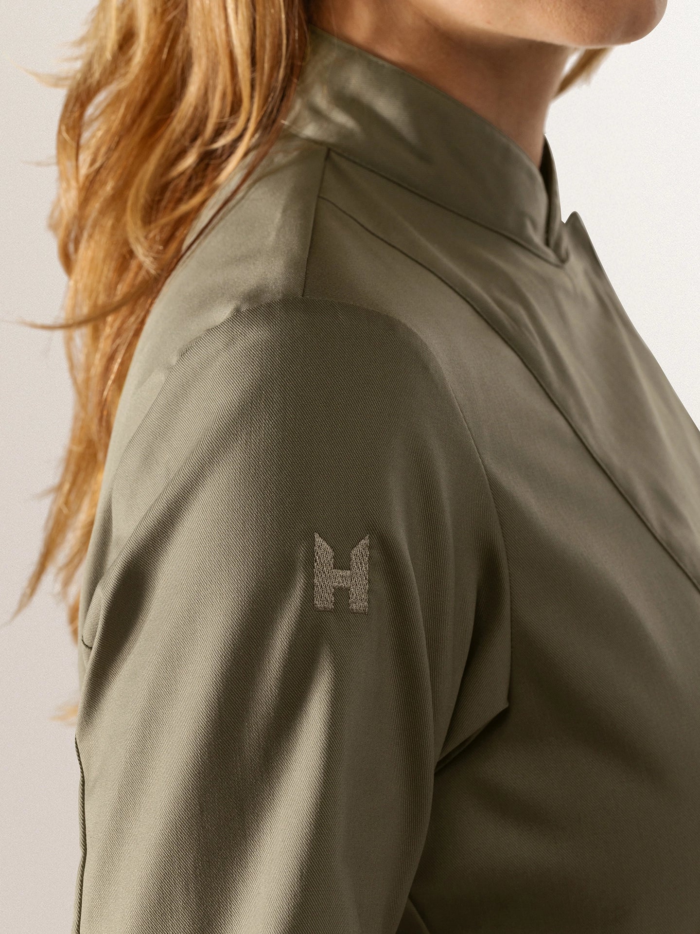 | Produktmerkmale | Gesticktes Le Nouveau Chef H auf dem Ärmel Hoher Stehkragen Lange Ärmel Schürzenschlaufe mit Druckknopf Unsichtbare Druckknöpfe Versteckte Tasche und Tasche am Ärmel |