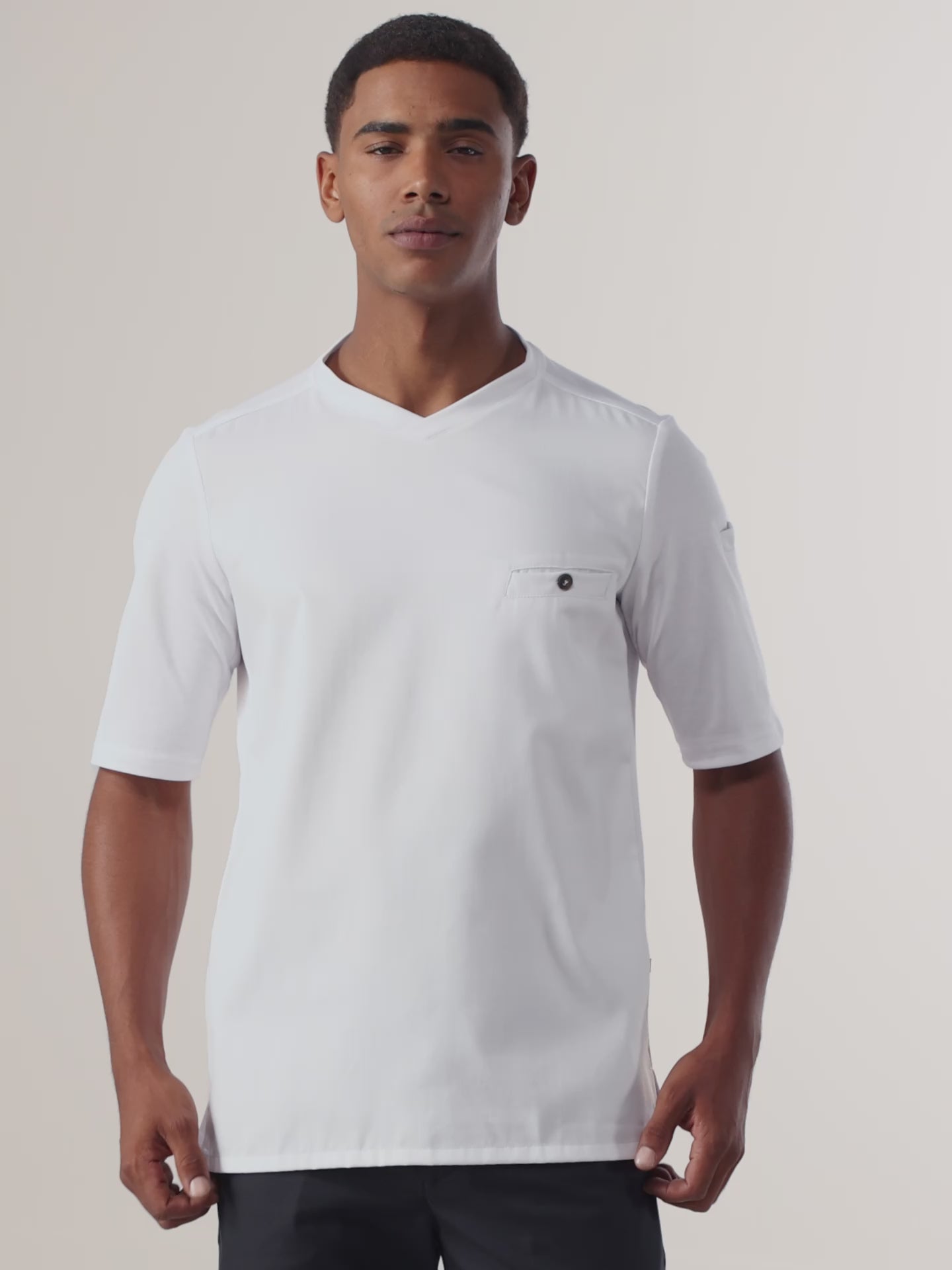 | Product features | Apron add-on with press stud Breast pocket and pen pocket on sleeve Embroidered Le Nouveau Chef H on sleeve Over the head Short sleeves V-neck |