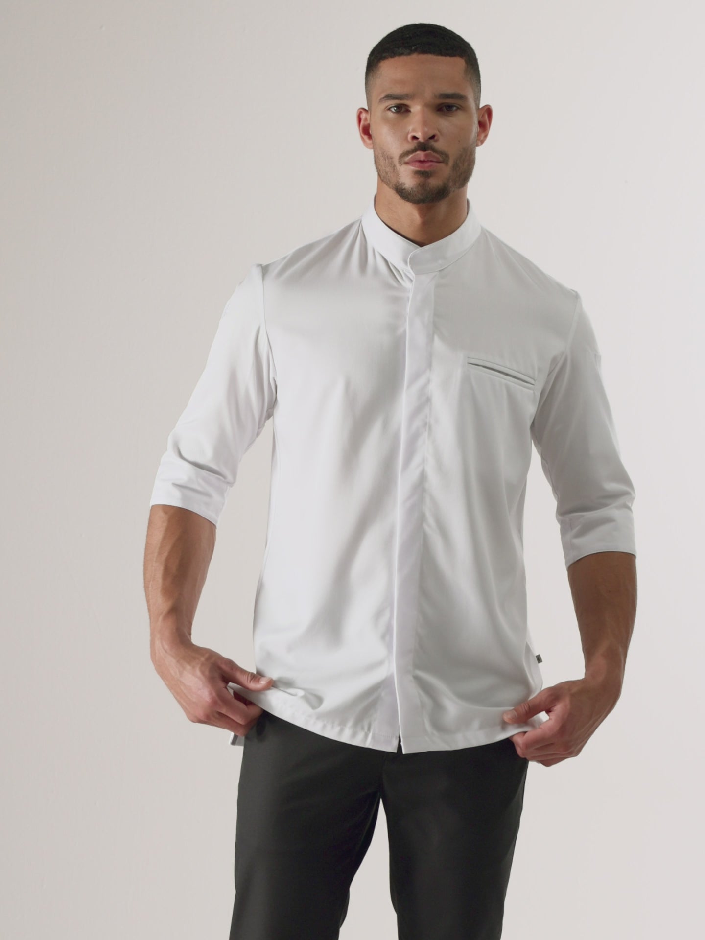 | Caractéristiques du produit | Bolsillo en el pecho y bolsillo para bolígrafo en la manga. Botones de presión invisibles Bucle de delantal con botón de presión Cuello alzado alto Le Nouveau Chef H bordado en la manga Mangas 3/4 |