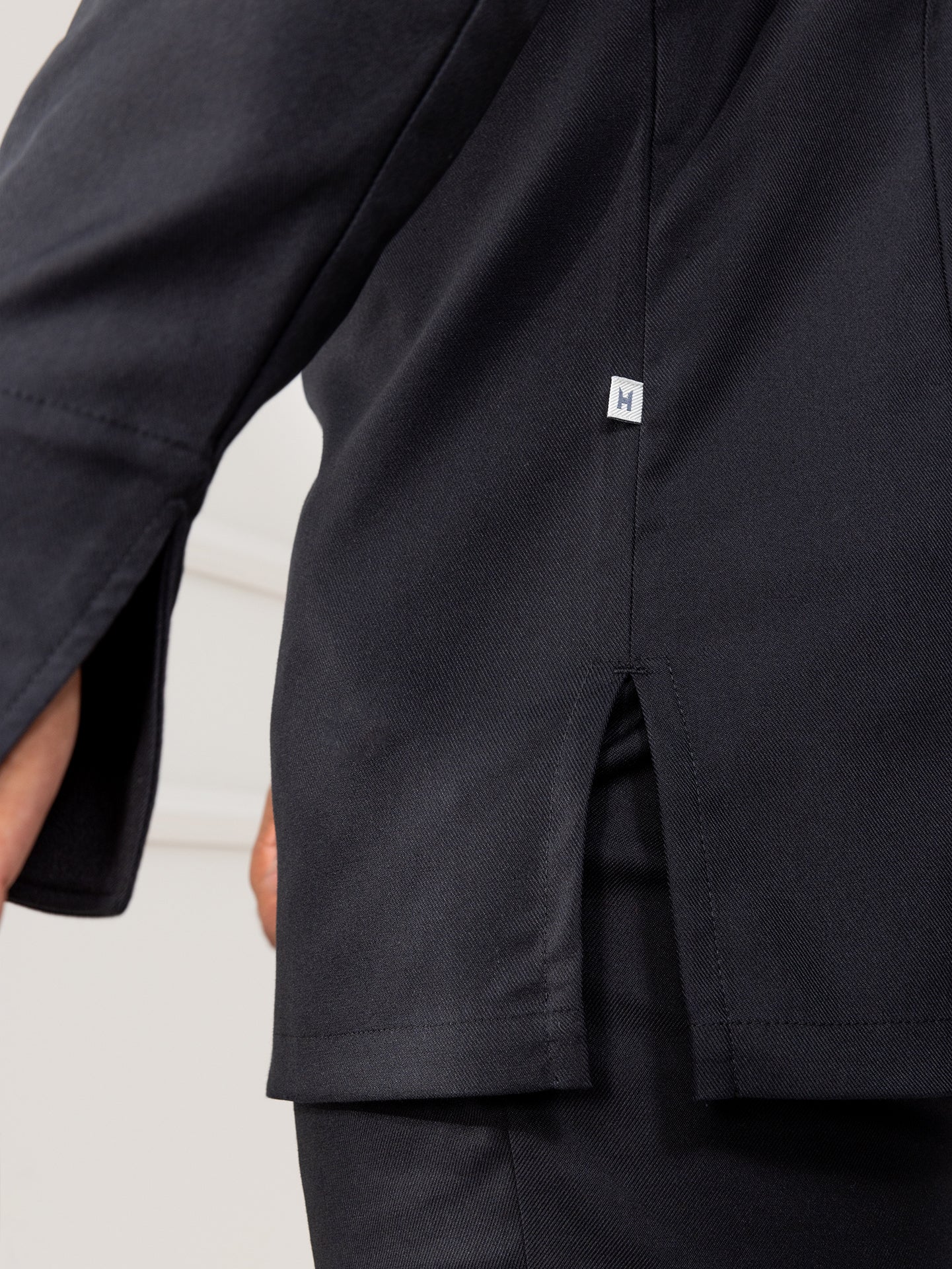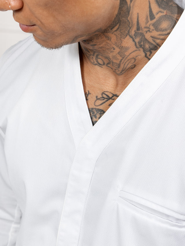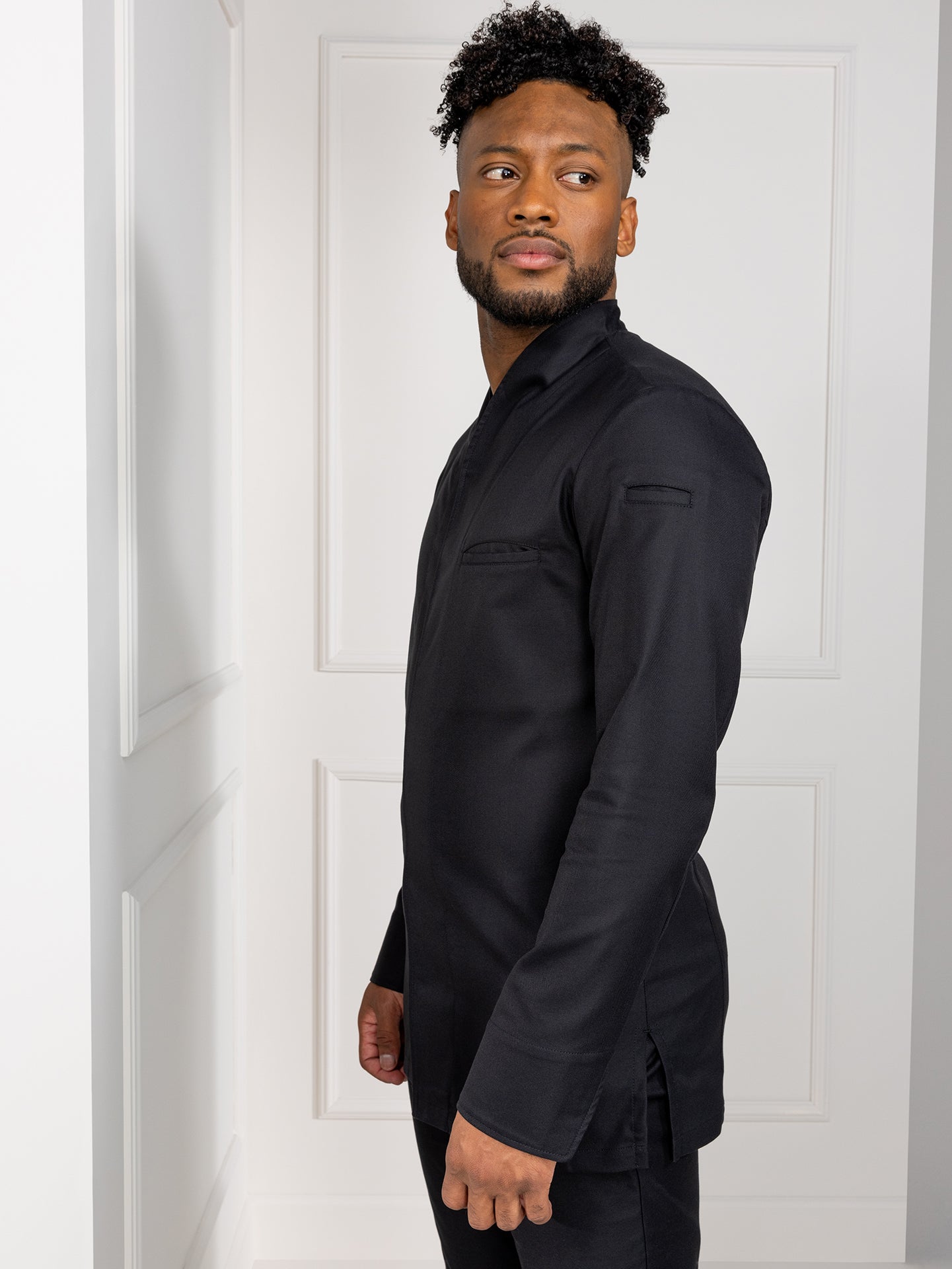 | Caractéristiques | Boucle de tablier avec bouton-pression Brodé Le Nouveau Chef H sur la manche Clous extra fins (pour un repassage facile) Col montant haut Manche longue Poche poitrine et poche stylo sur la manche |