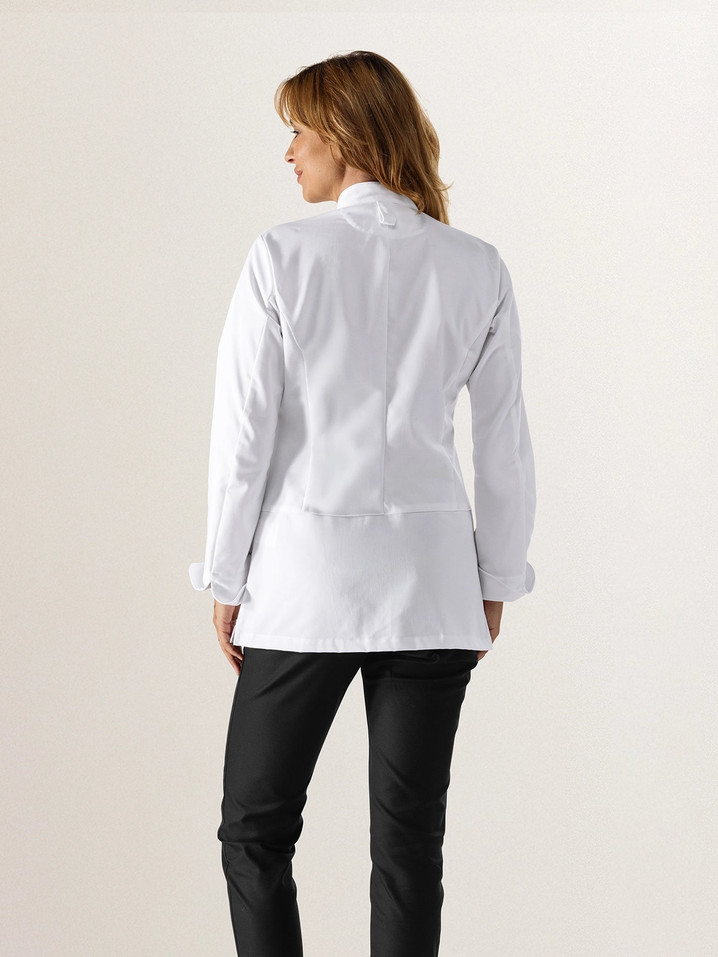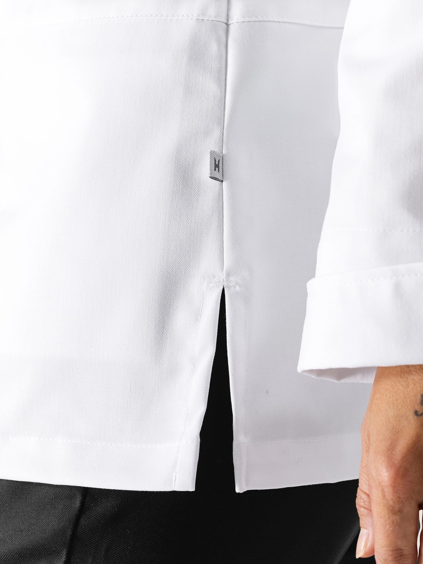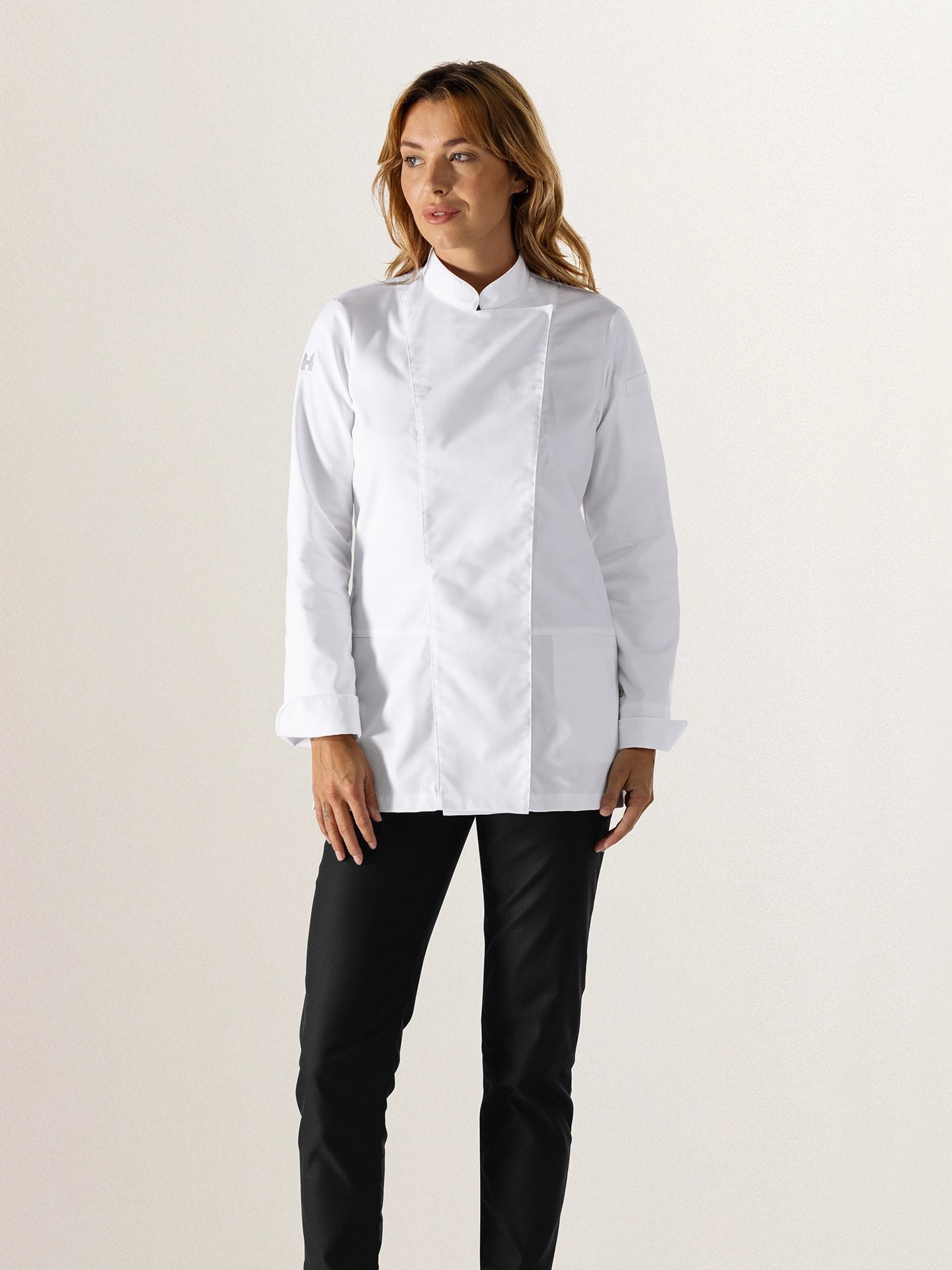 | Caractéristiques | Boucle de tablier avec bouton-pression Boutons pression invisibles Brodé Le Nouveau Chef H sur la manche Col montant haut Manche longue Poche cachée et poche sur la manche |