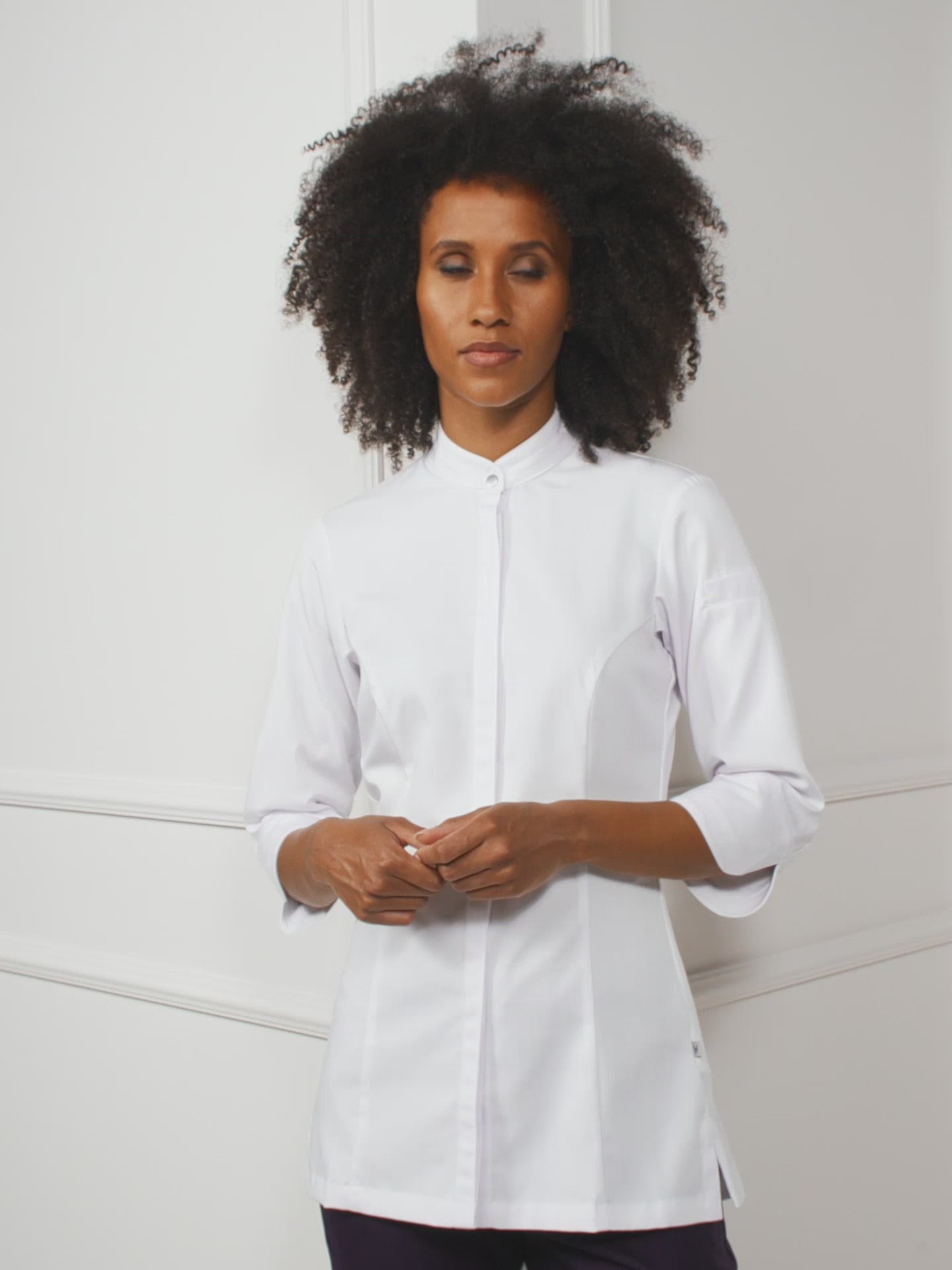 | Caratteristiche del prodotto | Accessorio per grembiule con bottone a pressione ricamo "H" Le Nouveau Chef sulla manica colletto alto bottoni a pressione invisibili maniche lunghe tasca sulla manica. |