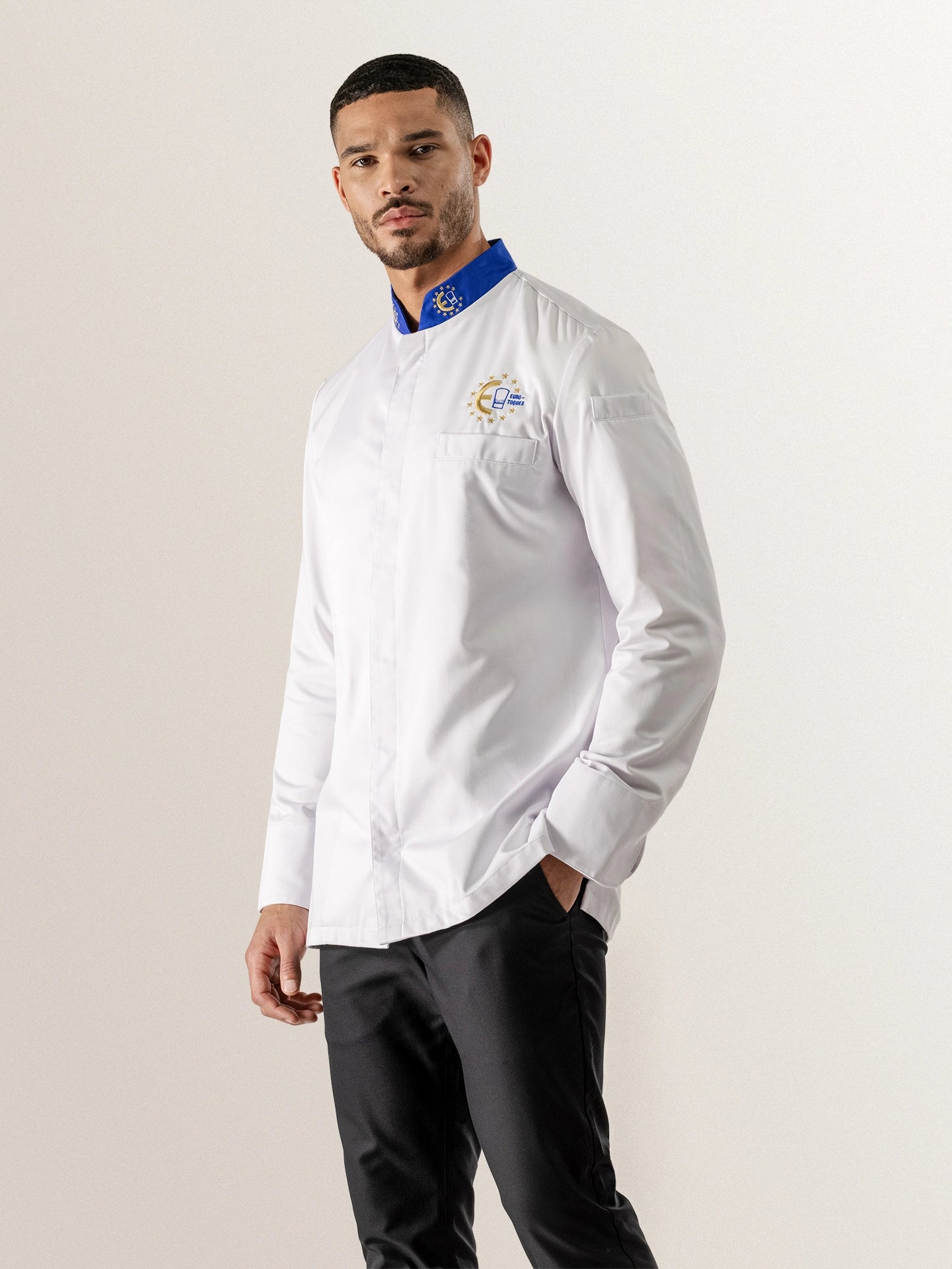 | Eigenschappen | Borstzak en pennenzakje op de mouw Geborduurde Le Nouveau Chef H op de mouw Hoge opstaande kraag Lange mouw Onzichtbare drukknopen |