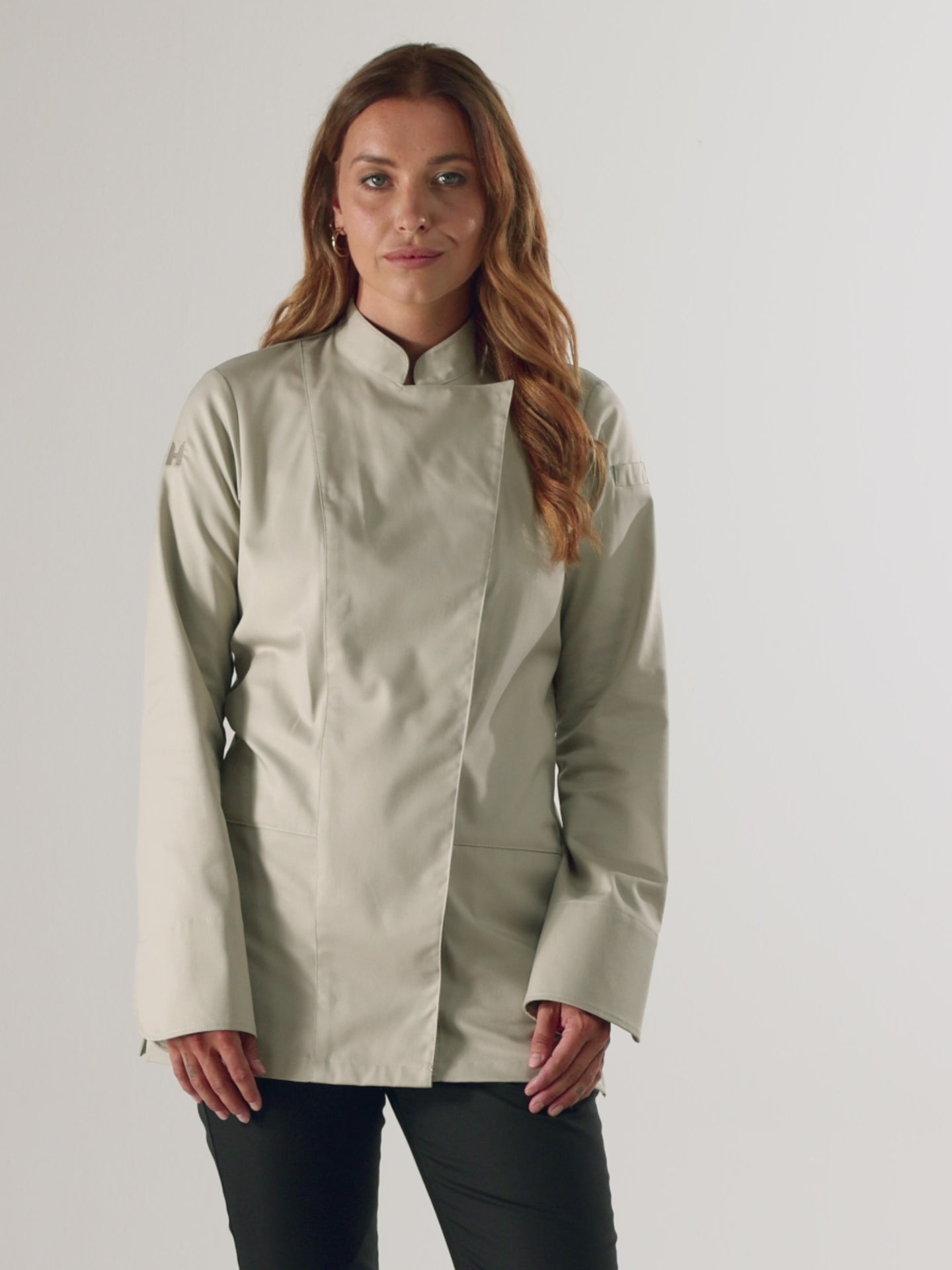 | Eigenschappen | Binnenzak en zak op de mouw Geborduurde Le Nouveau Chef H op de mouw Hoge opstaande kraag Lange mouw Onzichtbare drukknopen Schortenlus met drukknoop |